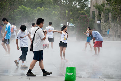 The two of them spoke no English at all, so most of our communication was limited to nodding, smiling, and pointing at the things that interested us. I would point at his tea container on the table that was full of yellow and orange flowers -- every once in a while a steward would come and fill it up. He pointed at my book on the history of China. We'd smile and nod, and then return our eyes to the hazy landscape outside our window. Even though we were far from the major city centres, passing by villages made from brick or cratered concrete, into farm country where we often couldn't see much because there were tall trees and brush that grew alongside the track, still, there was always a haze of smog.